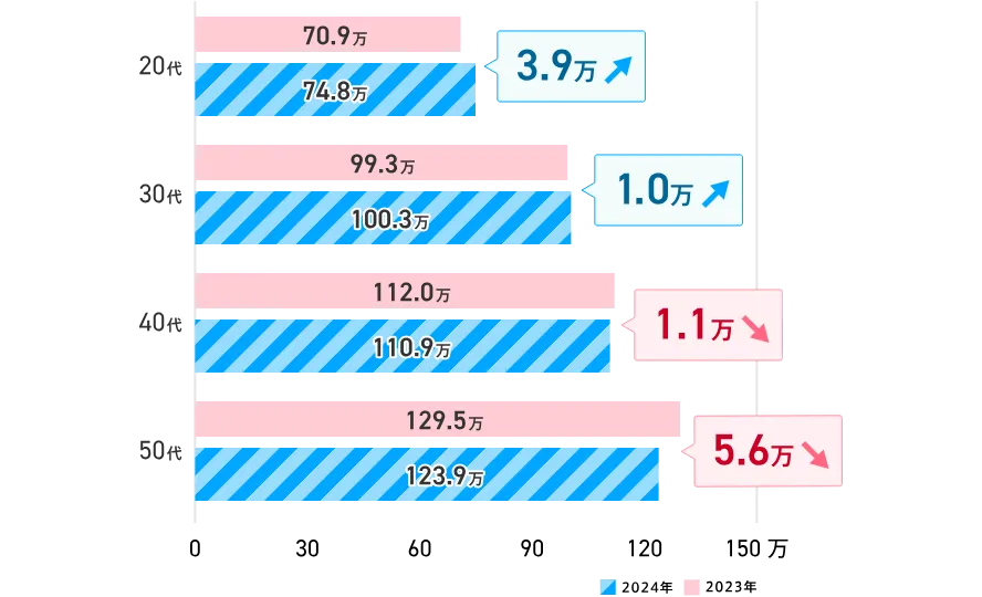 dodaの「ボーナス平均支給額調査2024年版」によれば、20代と30代のボーナスは前年より増加した一方で、40代と50代は減少しました。これには、企業が若手人材を獲得・定着させるために、若手社員への支給額を増やしている背景があります。特に、ITやサービス業界ではその傾向が顕著です。