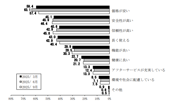 商品やサービスを選ぶときに何を重視するかという質問に対し、トップはもちろん「価格が安いこと」。しかし、僅差で「安全性が高い」「信頼性が高い」が続いています。